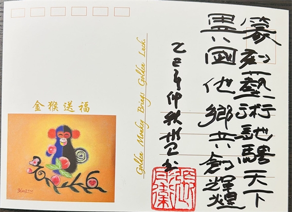 面對這份厚禮,張彤衛女士的回贈同樣意味深長。她選擇了一張由自己設計繪製的十二生肖猴年紀念明信片。猴,恰是她的生肖屬相,這使得禮物帶上了鮮明的個人印記,顯得格外親切與真誠。更重要的是明信片上的題字: