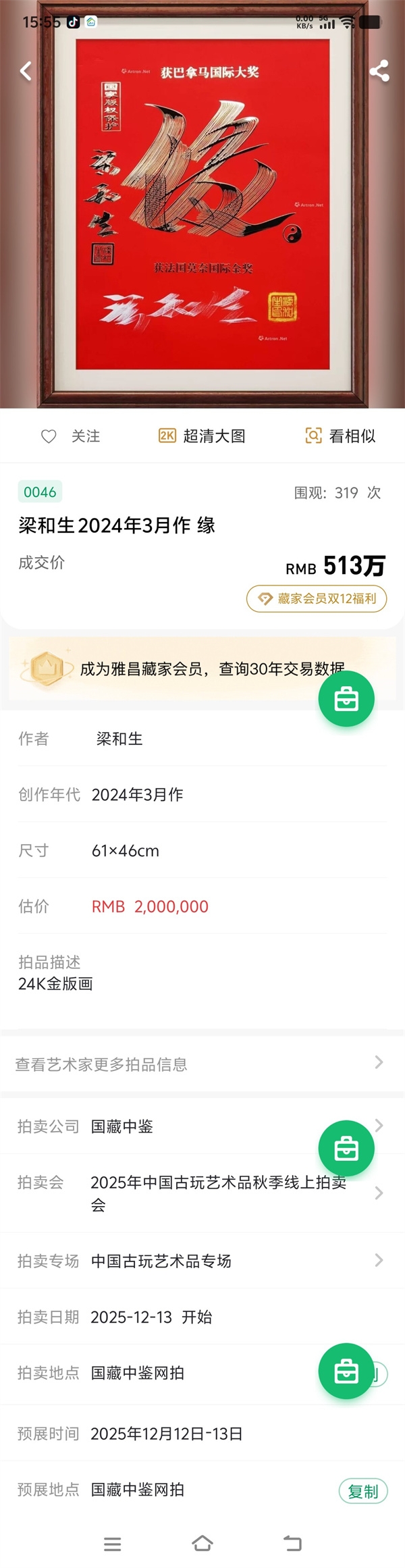 雅昌网的缘字拍卖纪录:513万元