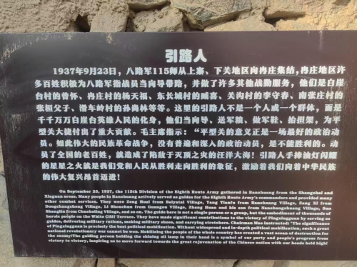 当晚,八路军战士踏着泥泞的道路一路小跑,草鞋都磨烂了。灵丘县平型关滑车岭村村民孙尚林和乡亲们纷纷把自己的衣服、鞋子硬塞给战士们。此时,一名叫孙毅的八路军首长提出需要几个年轻力壮的老乡带路。手持煤油马灯的孙尚林毫不犹豫地自告奋勇,为孙毅首长带路。这一勇敢的举动,便是后来广为流传的《抗日引路人》故事的开端。