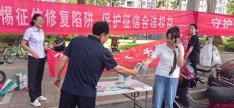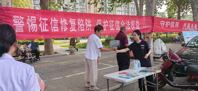 支行综合宣传组相关同志以“守护信用 共赢未来”为宣传主题,在宣传现场摆设宣传版面,悬挂“警惕征信修复陷阱 保护征信合法权益”等宣传横幅,摆设宣传展台,向过往群众发放宣传折页,讲解征信等相关金融知识。