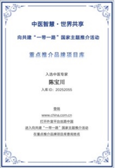 2025年,著名中医专家陈宝川成功入选“一带一路”国家主题推介重点推荐专家品牌库,并获得权威编号认证。此次活动旨在面向全球推广具有中华文化代表性的中医药人物,推动中国传统医学在国际舞台的可持续传播与交流。陈宝川的入选,不仅代表了其五十余载临床积淀与学术探索的阶段性成果,更昭示着中医药在新时代国际格局中的崭新使命。