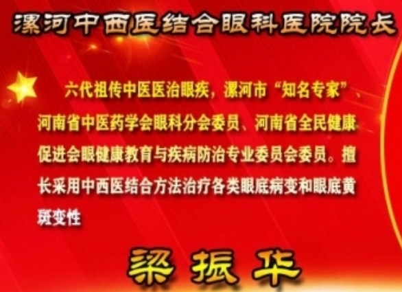 眼科专家梁振华院长出身中医世家,自幼研习中医理论,随父亲佐脉随诊,济世行医。从医以后梁振华深信祖国医学的宝贵和深奥,一定能够发掘出医治被眼科界公认的、最难治疗眼病的精髓,因此90年代开始常年带领自己的科研团队致力于此,研发出以“十二味明目口服液”为主线的治疗眼底病变和眼底黄斑变性最佳方法,填补了国内外中医治疗此类疾病的空白。并两次获得地市级科技成果二等奖。是我省较早运用中西医结合诊断和治疗眼部疾病的专家之一。30余年来积累了深厚的理论知识和丰富的临床经验。在治疗黄斑病变、糖尿病眼底病变、视网膜静脉阻塞、视网膜色素变性、眼底出血等眼科疾病上颇具造诣。对眼睑疾病、泪道疾病、角膜炎、白内障、青光眼、玻璃体浑浊、迎风流泪怕光等眼病治疗更是有其独到之处,使许多无望的眼疾患者重见光明,深受广大群众赞誉和好评。对青少年近视、散光及弱视等独创穴位埋线疗法,方法独到,效果好,随治随走,不影响学习和工作。