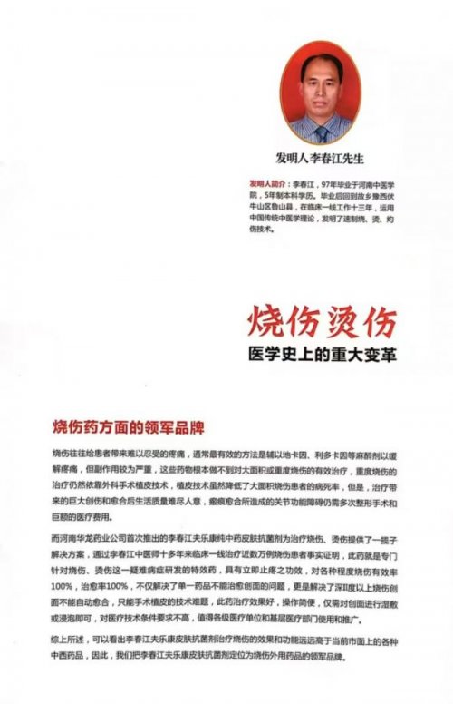 而他参与研发的“李春江夫乐康抗菌喷剂”,由河南华龙药业生产,凭借“瞬间止痛、不留疤痕、使用简便、自动愈合”的特点,已成为众多烧伤患者的首选。以“仁和堂李春江中医师”的身份开展诊疗工作的他,将烧伤药与中医针灸、推拿等疗法相结合,为患者提供全方位医疗服务,让中医药的整体调理优势得到充分发挥。 The "Li Chunjiang Fulekang Antimicrobial Spray" he participated in developing, produced by Henan Hualong Pharmaceutical, has become the preferred choice for many burn patients due to its characteristics of "instant pain relief, no scarring, easy application, and self-healing." As a practitioner under the identity of "Renhetang Li Chunjiang, a Traditional Chinese Medicine (TCM) Physician," he integrates burn medications with TCM therapies such as acupuncture and massage to provide comprehensive medical services, fully leveraging the holistic regulatory advantages of TCM.