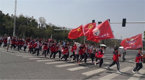 正午阳光炽热,少年步履铿锵。12:40分,全校师生身着整洁校服,在操场列队整装。随着一声令下,队伍如长龙般蜿蜒出校门。沿途精神饱满的少年与飘扬的党旗、团旗、校旗、班旗交相辉映,成为春日里最动人的风景。