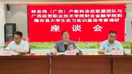 导读:大学生:高飞就业实习实训的彩虹天空兴隆平安 咨政联盟团队与广西经贸职业技术学院财会金融学院赴隆 安县大学生实习实训基地考察调研侧记 王伟英 刘刚 张贺萍 贺俊刚 在林忠伟(广西)产教科咨政联盟(下称咨政联盟)主席林忠伟教授,咨政联盟副秘书长、广西