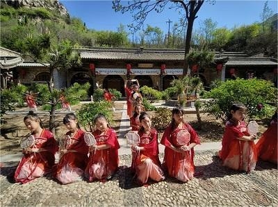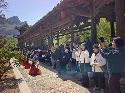 觉山书院内,百年魏紫牡丹正值盛花期,檀紫色花瓣层层叠叠,与非遗展示、书法绘画交流、投壶射箭等功能区相映成趣。游客穿梭其间,可赏牡丹国色、品井水泡茶、观墨韵书香、体验传统游艺,在“一天阅尽千年”的行程中,感知灵丘“八百里太行万山叠翠”的生态之美与“古今交织、文武兼备”的人文魅力。